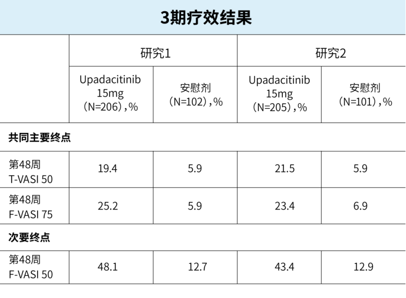 在两项研究中,约70%的受试者基线时的T-VASI>10。与安慰剂相比,upadacitinib在第48周达到了共同主要终点T-VASI 50(T-VASI评分较基线降低≥50%)和F-VASI 75(F-VASI评分较基线降低≥75%)。在两项研究中,在关键排序次要终点方面观察到upadacitinib与安慰剂存在统计学显著差异,包括第48周时的F-VASI 50。