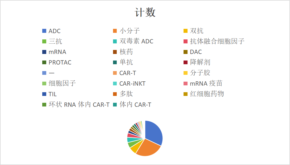 双毒素 ADC(12 个,4.8%)、抗体融合细胞因子(10 个,4.0%)、mRNA(6 个,2.4%)、核药(6 个,2.4%)、PROTAC(5 个,2.0%)等创新形态快速崛起。核药在 FAP、SSTR2 等靶点的布局,mRNA 疫苗与体内 CAR-T 的探索,展现出中国药企对下一代技术的敏锐嗅觉与前瞻布局。 这一格局意味着:中国创新药已摆脱单一技术路径依赖,形成以ADC为核心、小分子为根基、多技术路线协同发展的生态,为全球肿瘤治疗提供更多 “中国方案”。