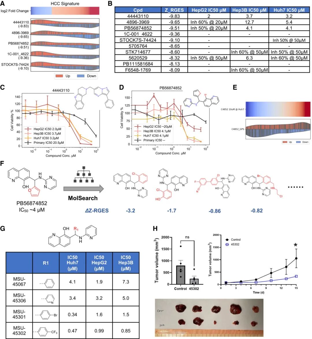 更重要的是,研究团队进一步利用平台内置的“分子搜索”优化算法,对PB56874852进行结构改造。设计出的新衍生物MSU45302,其体外抗HCC活性提升至亚微摩尔级别,数倍于一线靶向药索拉非尼。在HCC小鼠移植瘤模型中,瘤内注射MSU45302能显著抑制肿瘤生长。