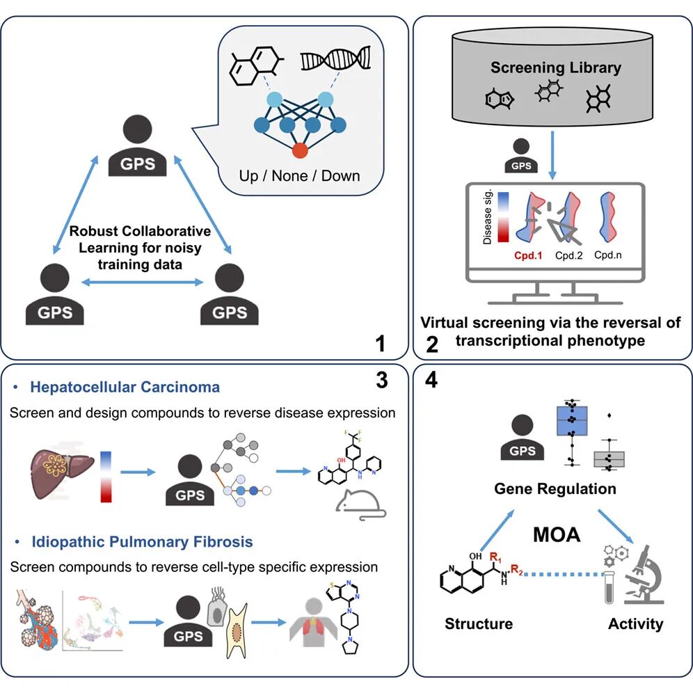 传统的基于转录组学的药物重定位研究受限于已有化合物数据库的规模,难以用于全新药物发现。GPS平台的核心突破在于,它训练了一个深度学习模型,能够仅输入化合物的结构指纹,就预测其可能引起的基因表达上调、下调或无影响的变化特征。