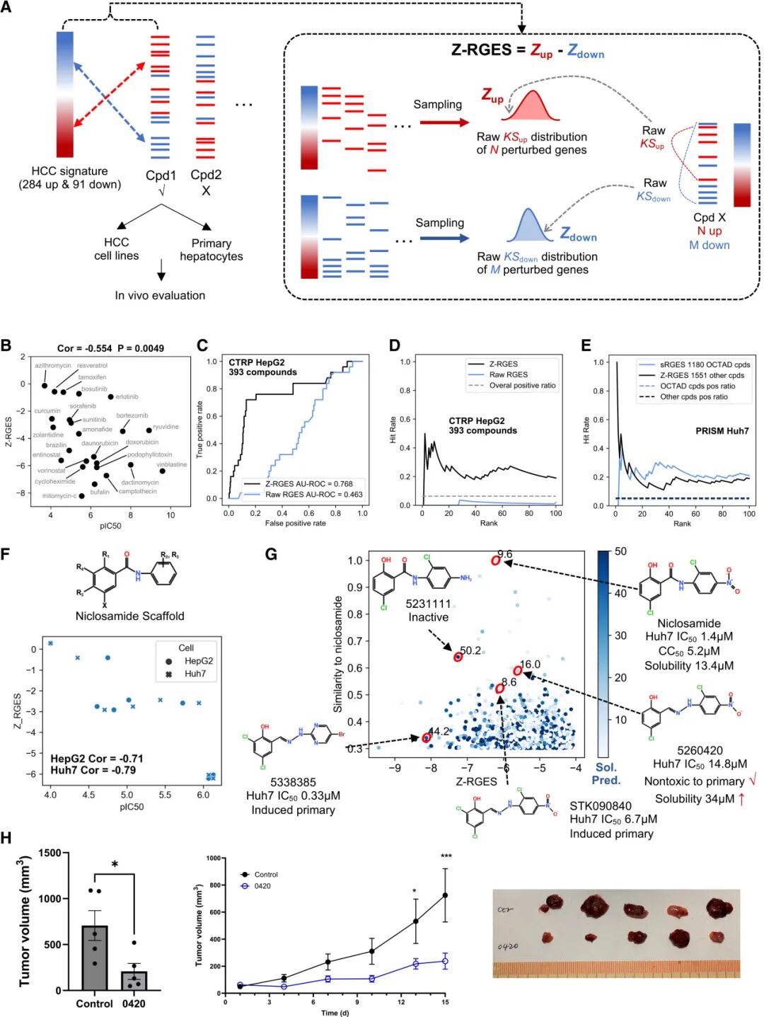 研究团队首先将GPS平台应用于肝细胞癌的药物发现。他们利用一个已定义的HCC疾病基因特征,对虚拟库中的所有化合物进行“逆转评分”筛选。评分越负,表明化合物逆转疾病特征、恢复健康转录表型的潜力越大。