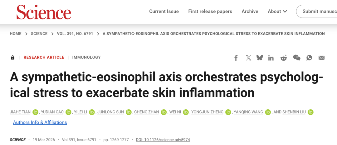 [1]Tian, J., Cao, Y., Li, Y., Sun, J., Cheng, Z., Wei, N., Zheng, Y., Wang, Y., and Liu, S. (2026). A sympathetic–eosinophil axis orchestrates psychological stress to exacerbate skin inflammation. Science 391, 1269–1277.