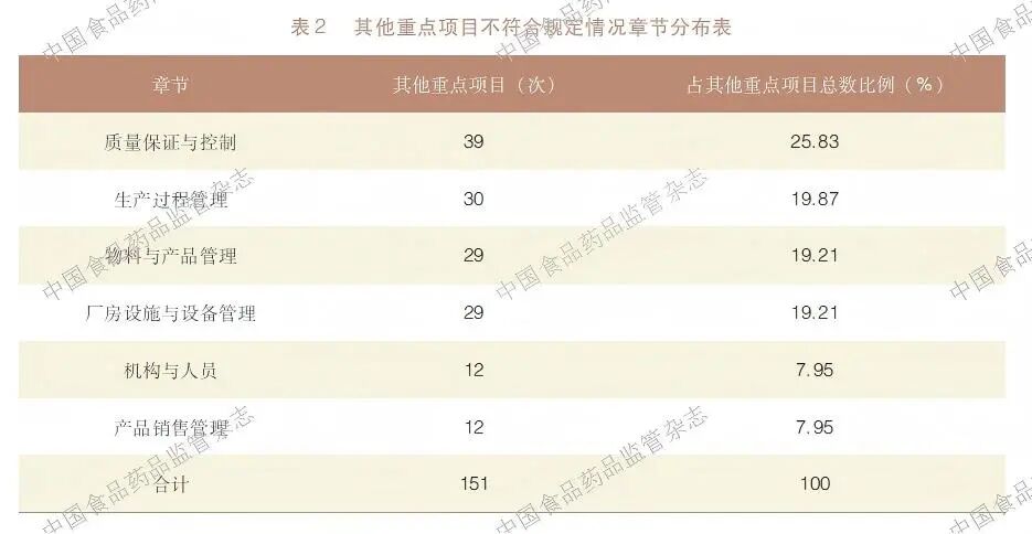 从表2 可以看出,各章节中其他重点项目不符合规定项的频次分布整体可为三个层次:第一层次为质量保证与控制,不符合规定项频次最高;第二层次包括生产过程管理、物料与产品管理以及厂房与设施设备管理,不符合规定项出现频次次之,三个章节之间不符合规定项频次无明显差异;第三层次为机构与人员及产品销售管理,不符合规定项频次相对较少。