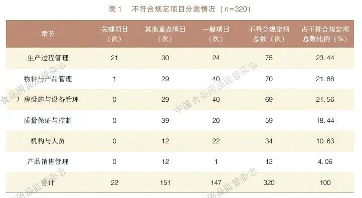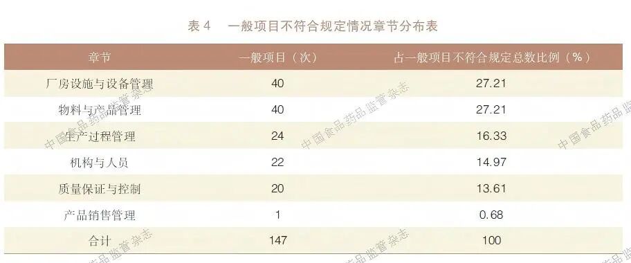 按照《检查要点》各章节进行分类,一般项目不符合规定项出现频次依次为厂房设施与设备管理、物料与产品管理、生产过程管理、机构与人员、质量保证与控制、产品销售管理,见表4。