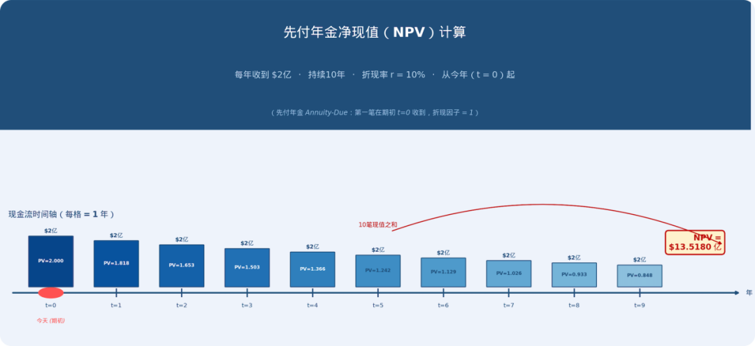 大概如此,国内市场算下来,能打入的市值294亿元。但还有VOR这边的国外收入,毕竟里程碑付款40亿美元,假设10年内拿到20亿美元,平摊到每年2亿美元,根据r=10%折现,可以得到净现值为13.52亿美元收入,约合人民币93亿元。