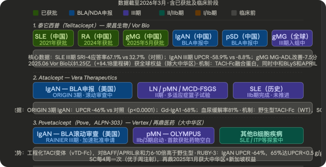 从机制上来说,泰它西普比过去,贝利尤单抗(Blys单抗)在系统性红斑狼疮和其他自免疾病上的表现为Blys靶向策略打了个样,BLyS维持成熟B细胞存活,APRIL则维持浆细胞(尤其是骨髓长寿浆细胞)的存活。贝利尤单抗只堵上游,泰它西普连下游也一起封住——这意味着它对病理性抗体的清除更彻底,覆盖的患者群更宽,在以抗体介导损伤为核心病机的自免疾病上,这个机制差异意义重大。