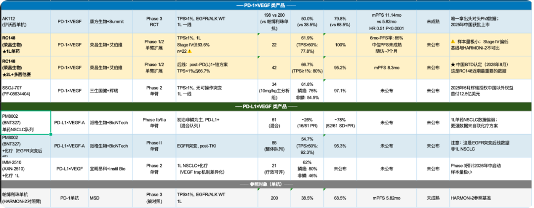 RC148的一线治疗PD-L1阳性NSCLC数据:ORR 57.1%。再看后线数据,RC148在20mg/kg剂量组做出了ORR 66.7%、PFS 8.3个月——注意这里联用了多西他赛,而AK112的单药二线数据是TPS≥1%患者ORR 42.9%、TPS<1%患者ORR 25.0%。直接比绝对值,RC148在联用方案下的数据更好看,但我们要诚实:这不是head to head,基线不完全可比,不能刻舟求剑。