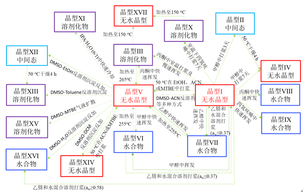 晶型转化关系研究结果显示无水晶型I室温下特定的水活度条件中稳定,且具有良好的物理和化学稳定性、几乎无引湿性、符合开发需求的溶解度,最终推荐为优势晶型。