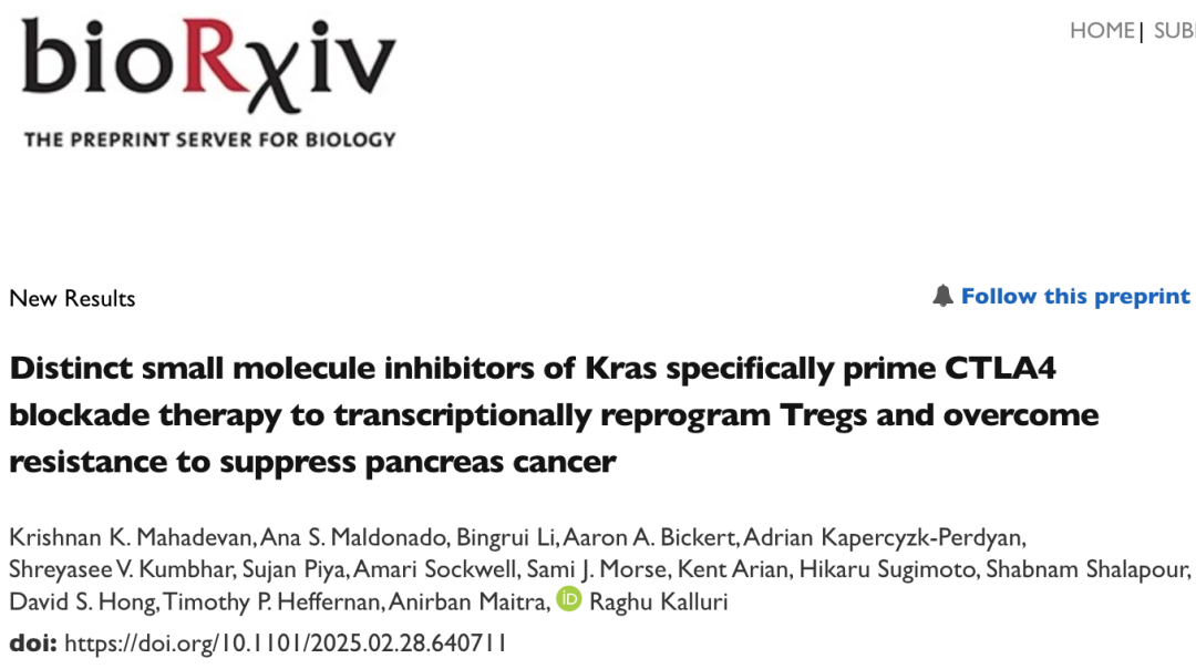 Krishnan K Mahadevan, et al., Distinct small molecule inhibitors of Kras specifically prime CTLA4 blockade therapy to transcriptionally reprogram Tregs and overcome resistance to suppress pancreas cancer.