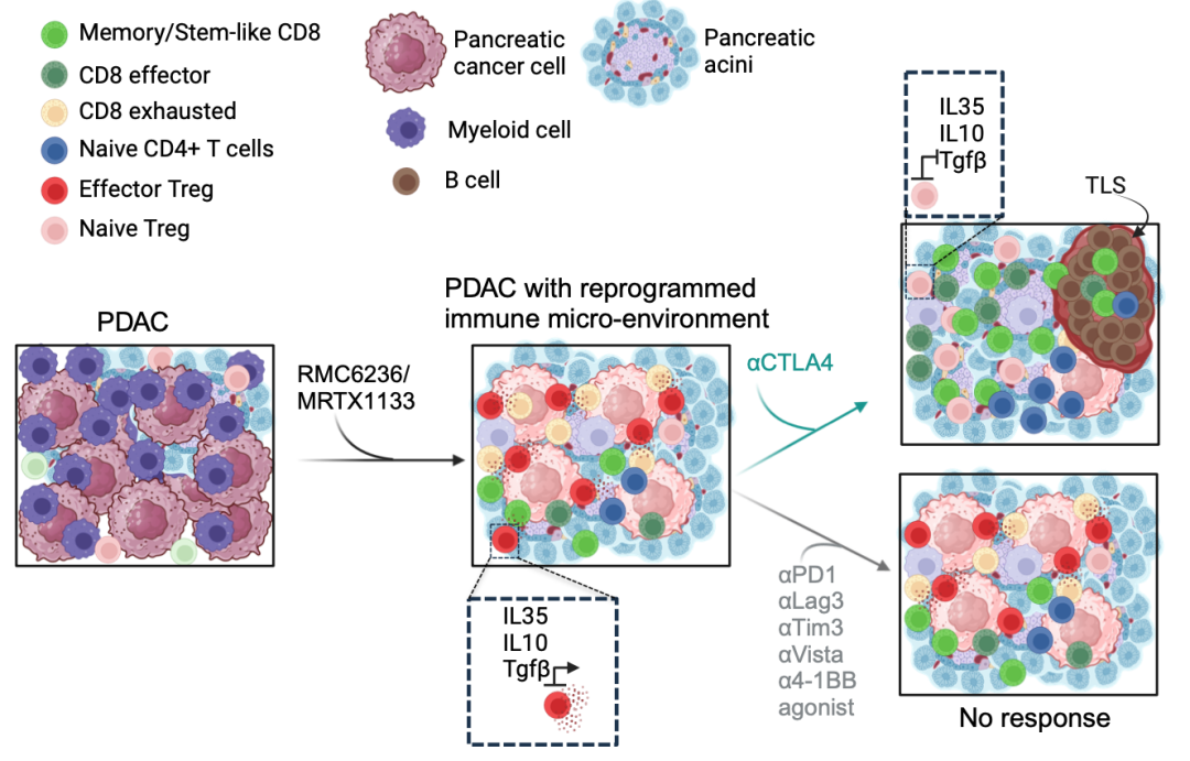 科学家们最初通过先进的单细胞检测技术发现了一个现象,当我们使用KRAS抑制剂去攻击肿瘤时会导致肿瘤内部出现非常大的变化,尽管靶向药杀灭了很多胰腺癌细胞,但是肿瘤为了自保会招募大量的调节性T细胞(Tregs)。这些调节性T细胞属于免疫系统里的“维稳派”或“刹车细胞”。它们在进化上的作用是防止免疫过激而伤害到人的身体,但在肿瘤里这些细胞却充当了“内奸”,它们死死地按住那些想要杀敌的免疫细胞,因此会让总体治疗的效果大打折扣。