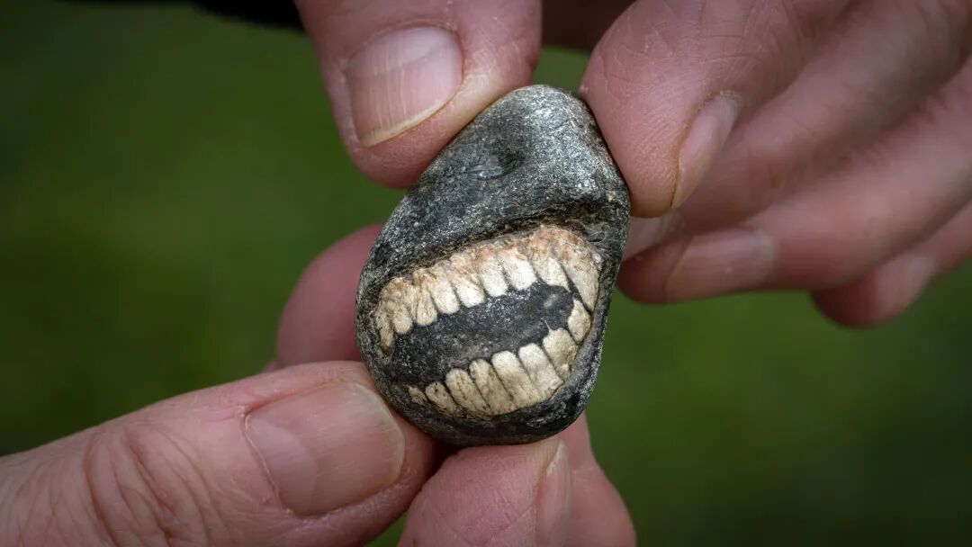 这块咧嘴笑的石头其实是古生物化石,不是偶尔形成的动物状物体。“齿列”是化石化的部分海百合茎干。海百合属于棘皮动物,这一门中还包括了海胆和海参。它们出现于约5亿年前,目前仍有近亲存世。Christine Clark在英国林迪斯法恩圣岛(Holy Island of Lindisfarne)寻找化石时,发现一块小石子好像在对着她笑。“看着像谁的假牙似的。”她说。