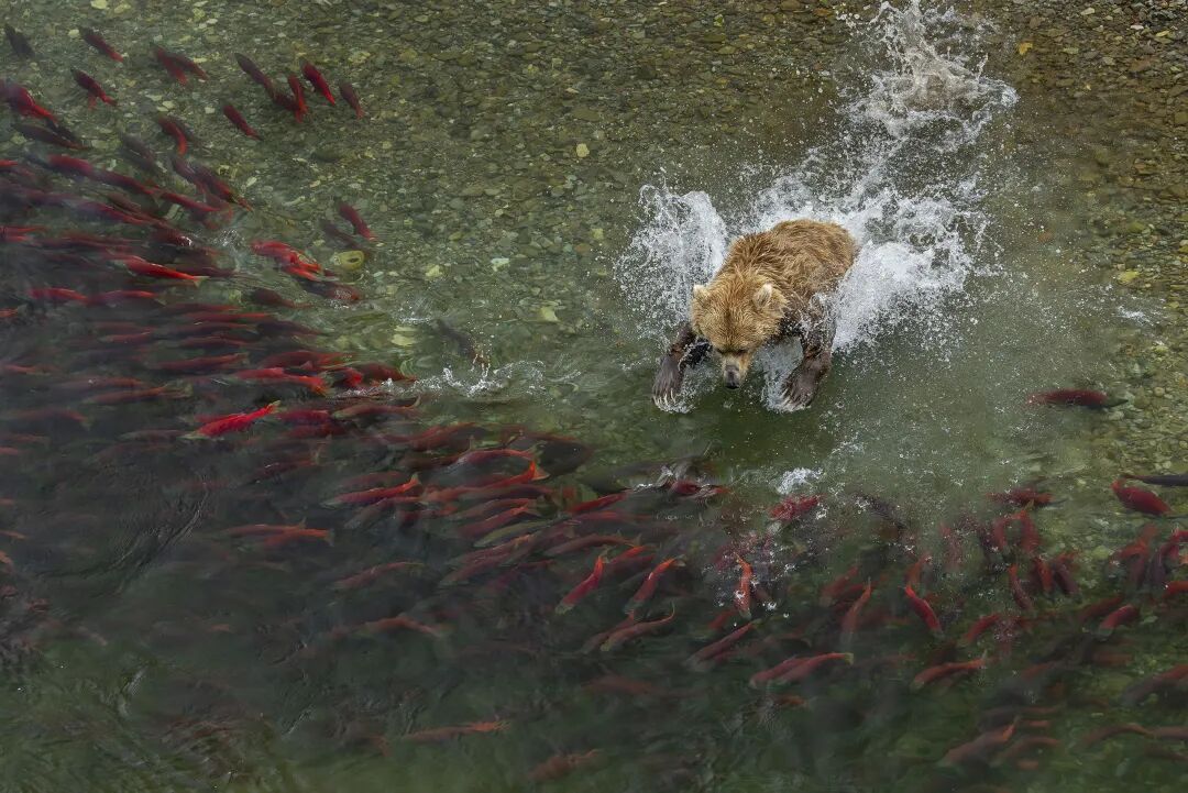 在阿拉斯加的卡特迈国家公园,一只饥饿的棕熊(Ursus arctos)冲进溪流捕食红大麻哈鱼(Oncorhynchus nerka)。摄影师Charlie Wemyss-Dunn的这张照片赢得了金奖,他在8月栖身悬崖顶部以观察棕熊捕猎洄游鱼类的场景。