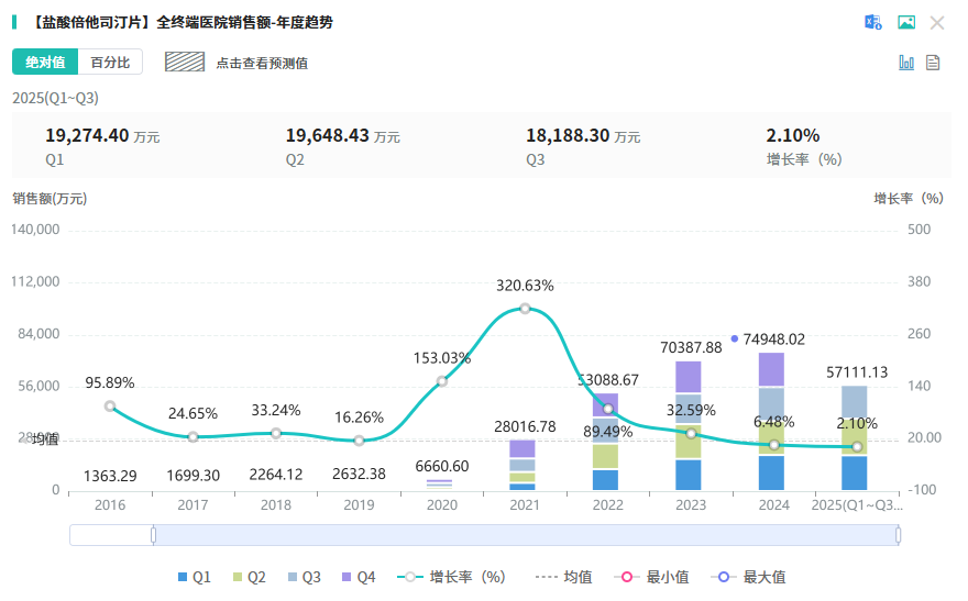 盐酸倍他司汀原研为迈兰公司研发,是一种类组胺药物,主要用于治疗梅尼埃病相关的眩晕、耳鸣和听力下降,临床应用历史已久的特效药。该药不仅是2018年版国家基药目录品种,也位列2019年版国家医保目录,并获得国内相关眩晕症诊疗专家共识的推荐。据摩熵医药数据,盐酸倍他司汀在医院终端市场表现稳健:2024年全终端销售额超过7亿元,同比增长6.48%;2025年前三季度销售额已超5亿元,同比增长2.10%。
