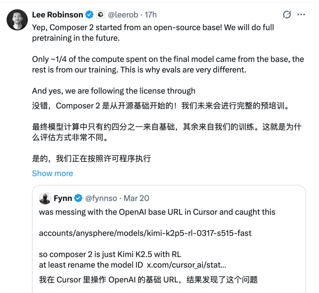 多方压力下,Cursor相关负责人出面致歉。Cursor教育开发者Lee Robinson发文称:没错,Composer 2始于开源,未来会进行完整的预训练。他尝试解释称:模型计算中只有四分之一来自基础模型,其余均来自团队的训练,因此评估方式不同。没有在一开始就提及Kimi模型是一个失误,团队会在下一个型号中进行修正。