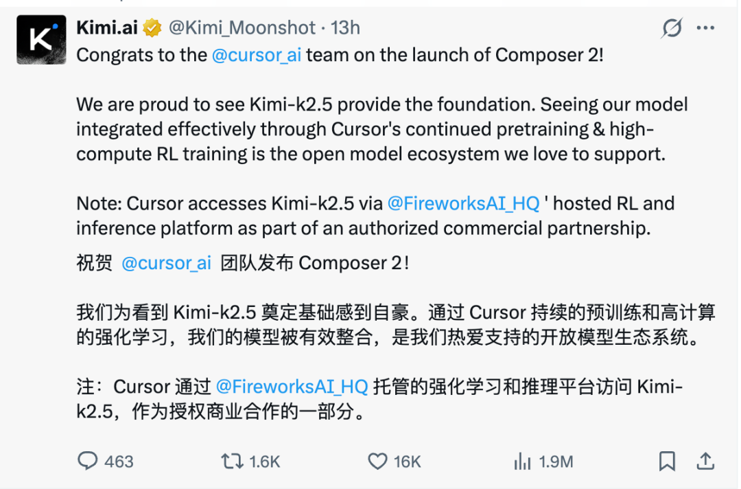最终事件得到了一个体面的结局——Kimi.ai官方账号发文称,祝贺Cursor团队发布Composer 2。很高兴看到KimiK2.5为其提供底层基座,模型通过Cursor 的持续预训练与高算力强化学习(RL)训练得到有效集成,这正是团队乐于支持的开放模型生态。作为授权商业合作的一部分,目前Cursor 已通过FireworksAI(云原生 AI 基础设施平台)托管的强化学习和推理平台访问 Kimi-k2.5。Kimi工作人员也删除了此前的吐槽内容。
