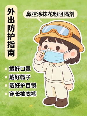 口罩、帽子、护目镜三件套,一个不能少。长袖衣裤穿上身,鼻腔里还可以涂点花粉阻隔剂,像给鼻子穿上一件“隐形防护衣”。
