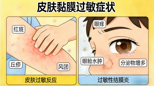 • 眼睛也不甘落后:眼痒、眼睑水肿、分泌物增多,妥妥的过敏性结膜炎。