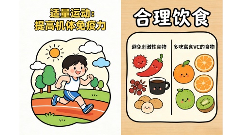 多吃富含维C的水果蔬菜,少吃辛辣刺激。运动可以提高免疫力,但最好选在清晨或雨后,这时候花粉浓度低,空气也清新。