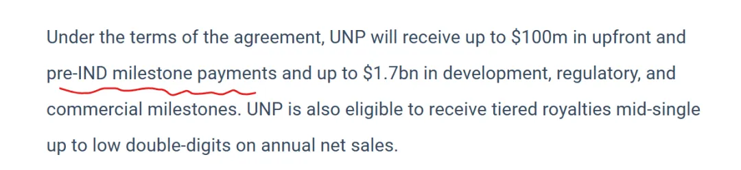根据协议,UNP 将获得最高 1 亿美元预付款及 IND 前里程碑付款(pre-IND milestone payments),另可获最高 17