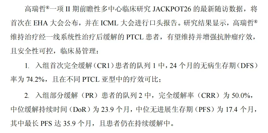 EHA年会和18-ICML上公布了全球首创新药戈利昔替尼针对经一线系统性治疗后缓解的外周T细胞淋巴瘤(PTCL)维持治疗的长期随访数据,显示有望维持并增强抗肿瘤疗效,且安全性可控,临床易管理。
