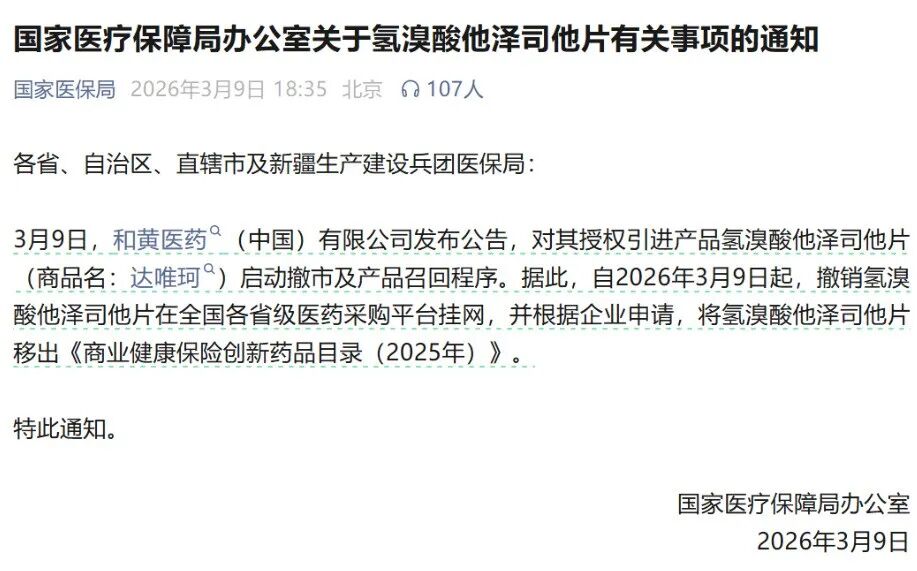 3月9日,国家医保局发布通知称,自3月9日起,撤销氢溴酸他泽司他片(商品名:达唯珂)在全国各省级医药采购平台挂网,并根据企业申请,将其移出《商业健康保险创新药品目录(2025年)》。这是一款用于治疗复发或难治性滤泡性淋巴瘤的药物,由法国药企Ipsen(益普生)旗下公司Epizyme研发,2021年和黄医药引入中国后,2025年3月获批附条件上市。从获批到撤市不足一年,与其可能引发恶性肿瘤有关。益普生在新闻稿中称,确证性临床试验SYMPHONY-1中观察到继发性血液系统恶性肿瘤风险,因此认为该治疗方案的风险可能超过潜在获益。哈尔滨血液病肿瘤研究所所长、中国临床肿瘤学会(CSCO)监事会监事长马军教授告诉“医学界”,该药物目前在中国仅有极少部分病人使用,目前暂未发现继发性恶性肿瘤不良反应。他同时强调,已经使用该药物治疗的患者还需要长期随访,观察其可能出现的各种副作用,尤其是继发性血液系统肿瘤。氢溴酸他泽司他,商品名为达唯珂®(TAZVERIK®),是一款全球同类首创的EZH2甲基转移酶抑制剂,主要用于治疗上皮样肉瘤和滤泡性淋巴瘤。据国家卫健委《罕见病诊疗指南(2025年版)》,上皮样肉瘤约占所有软组织肉瘤的不到1%,美国报道发病率约为4.1/1000万;滤泡性淋巴瘤则是最常见的惰性非霍奇金淋巴瘤,国内占比约8.1%~23.5%,发病率呈逐年上升趋势。作为全球首款针对上皮样肉瘤的新药,以及首个适用于肿瘤EZH2基因突变的药物,氢溴酸他泽司他在上市之初被认为极具临床价值,先后于2020年1月和6月通过美国FDA加速批准程序获批单药疗法,分别用于上皮样肉瘤和复发/难治性滤泡性淋巴瘤。在我国,氢溴酸他泽司他于2022年通过临床急需进口药品计划,获批在海南博鳌乐城国际医疗旅游先行区使用,后相继在澳门、香港获批。2025年3月,氢溴酸他泽司他获国家药监局附条件批准上市,用于治疗复发难治滤泡性淋巴瘤;2025年12月,该药物获纳入首批国家商业健康保险创新药品目录。和黄医药曾在相关业绩报告中提到,中国每年新增约9000例滤泡性淋巴瘤患者,其中约三分之一最终需接受三线治疗,EZH2突变的频率约为25%。此前,该药在各省挂网价为32260元/盒,上市一年仅售出250万美元。实际上,早在上市初期,FDA就在其说明书中增加了继发性恶性肿瘤风险的内容,包括T细胞淋巴母细胞淋巴瘤、骨髓异常综合征和急性骨髓性白血病,已被明确列在了该药处方信息中的警示一栏。根据益普生的公告,本次撤市基于公司正在进行的一项氢溴酸他泽司他联用其他药物的Ib/Ⅲ期临床试验新数据——即SYMPHONY-1试验。独立数据监测委员会(IDMC)建议,基于继发性血液恶性肿瘤的不良事件,该治疗方案的风险可能超过它带来的潜在益处。基于此,益普生决定主动将该药物产品撤市,包括滤泡性淋巴瘤(FL)和上皮样肉瘤(ES)两项适应证,随后和黄医药也发布撤市消息。除撤市外,益普生表示,将停止SYMPHONY-1研究中所有患者的氢溴酸他泽司他治疗和扩大用药计划。马军教授告诉“医学界”,氢溴酸他泽司他在中国属于附条件批准上市,此次全球撤市源于确证性临床试验中发现严重安全性信号。据研发公司Epizyme此前披露,截至2019年5月24日,在整个氢溴酸他泽司他研究项目中的822名患者中,有6名(0.7%)患者出现继发性血液淋巴系统恶性肿瘤。2018年4月,Epizyme还报告一名患有晚期低分化脊索瘤的儿童患者在接受氢溴酸他泽司他治疗约15个月后,发展为继发性T细胞淋巴瘤。基于此安全性信号,FDA对所有氢溴酸他泽司他临床试验实施了部分临床暂停。经风险评估和方案修订后,FDA于2018年9月解除了暂停。“这个比例实际非常高。”马军教授强调,“一般药物的严重副作用发生率都在0.5%以下,而这是0.7%的发生率,而且涉及的都是难以治愈的白血病、骨髓异常综合征和淋巴瘤。”值得注意的是,上述早期临床试验主要评估单药治疗,而SYMPHONY-1试验采用联合用药方案(他泽司他+来那度胺+利妥昔单抗)。这也意味着,氢溴酸他泽司他联合用药的实际安全性风险可能高于此前基于单药治疗数据所做的评估。在3月9日益普生发布的新闻稿中,公司研发执行副总裁兼负责人Christelle Huguet博士表示:“这项确证性研究的最新数据显示,与之前临床评估中观察到的情况相比,该药物的安全性并不理想。”马军教授告诉“医学界”,氢溴酸他泽司他在中国获批还不到一年,主要适应症为三线复发/难治的惰性滤泡性淋巴瘤,该药在中国的获批依据为一项单药治疗数据,而SYMPHONY-1试验评估的是联合用药方案,经他治疗的几例中国患者均为单药使用。“短期可能发现不了这种继发性肿瘤,因为用药时间还比较短。”马军教授指出,“必须进行长期随访。一旦发生T细胞淋巴母细胞淋巴瘤、骨髓异常综合征和急性骨髓性白血病,很可能与这个药物有关。”为何不采取更严格的药物监管方式,而是选择全球撤市?马军教授告诉“医学界”,滤泡性淋巴瘤本身属于惰性肿瘤,患者生存期可超过10年,甚至达到18年以上,部分患者不治疗也可长期生存。“当初氢溴酸他泽司他获批数据显示,EZH2突变型患者客观缓解率达69%,远超附条件上市标准,”他说,“但即便疗效显著,一旦在治疗过程中发生继发性白血病或骨髓增生异常综合征,患者往往在2—4年内死亡。”因此,对于慢性惰性疾病,一般药物是不能发生二次致癌性的。他解释,这与治疗急性白血病或晚期癌症不
