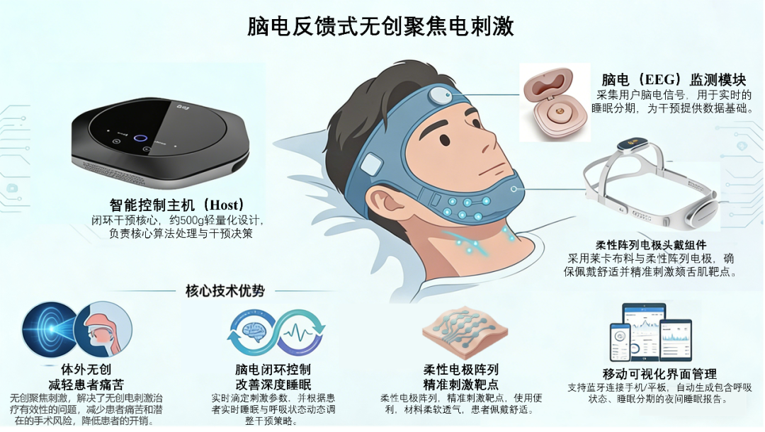 这一方向的关键突破,在于无创聚焦电刺激技术与脑电闭环反馈系统的融合应用。前者通过下颌柔性阵列电极聚焦电场,实现对目标肌群的精准刺激;后者则同步采集脑电(EEG)与呼吸信号,实时识别睡眠分期、呼吸状态及异常波动,并据此动态调整刺激参数。