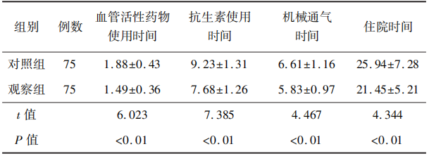 另一项随机对照研究中,使用白蛋白治疗组复苏目标达标率为84.00%,高于对照组的65.33%(P<0.01); 使用白蛋白治疗组病死率、并发症发生率均为1.33%,低于对照组的10.67%、9.33%(P<0.05)。使用白蛋白治疗组血管活性药物使用时间、抗生素使用时间、机械通气时间、住院时间短于对照组(P<0.01)(表1)。治疗24h后,2组CRP、IL-6、TNF-α水平低于治疗前,且使用白蛋白治疗组低于对照组(P<0.01);2组HR低于治疗前,MAP、CVP高于治疗前,且观察组变化幅度大于对照组(P<0.01)[8]。