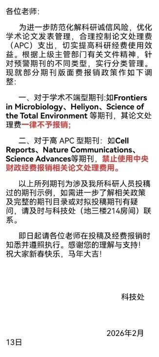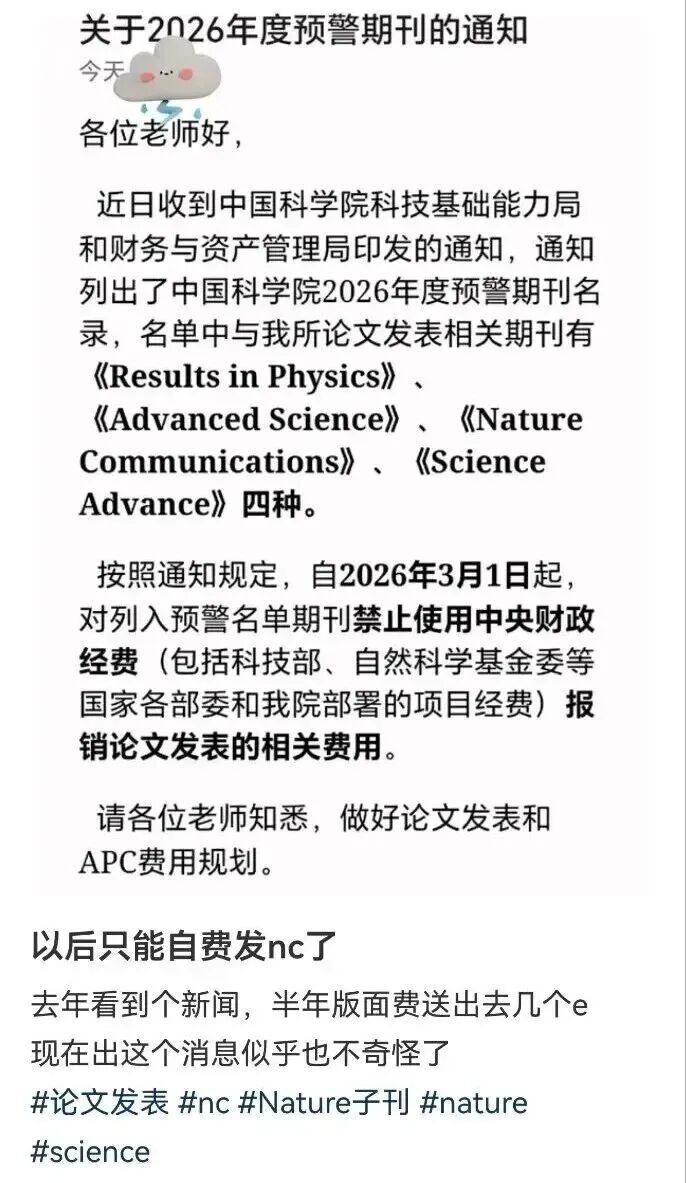 2月14日,有人在XHS发布了一张题目为2026年度预警期刊通知的截图,称收到中国科学院科技基础能力局和财务与资产管理局的通知,Nature Communications、Science Advance等期刊,以后不能报销了。