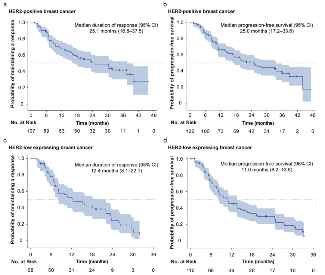 从 2020 年 9 月 7 日至 2024 年 6 月 4 日,共 396 名患者接受了 SHR-A1811 治疗,这些患者此前都已接受过 2-4 种治疗方案。截至 2025 年 3 月 12 日,HER2 阳性乳腺癌患者的中位随访时间为 17.1 个月,HER2 低表达乳腺癌患者为 10.6 个月,非乳腺癌患者为 4.3 至 8.2 个月。安全性特征与之前的报告一致。261 名患者(65.9%)出现了 3 级或更高级别的治疗相关不良事件,10 名患者(2.5%)出现了任何级别的间质性肺病。HER2 阳性乳腺癌患者的中位无进展生存期为 25.0 个月,HER2 低表达乳腺癌患者的中位无进展生存期为 11.0 个月,非乳腺肿瘤患者的的中位无进展生存期为 3.5 至 17.2 个月。