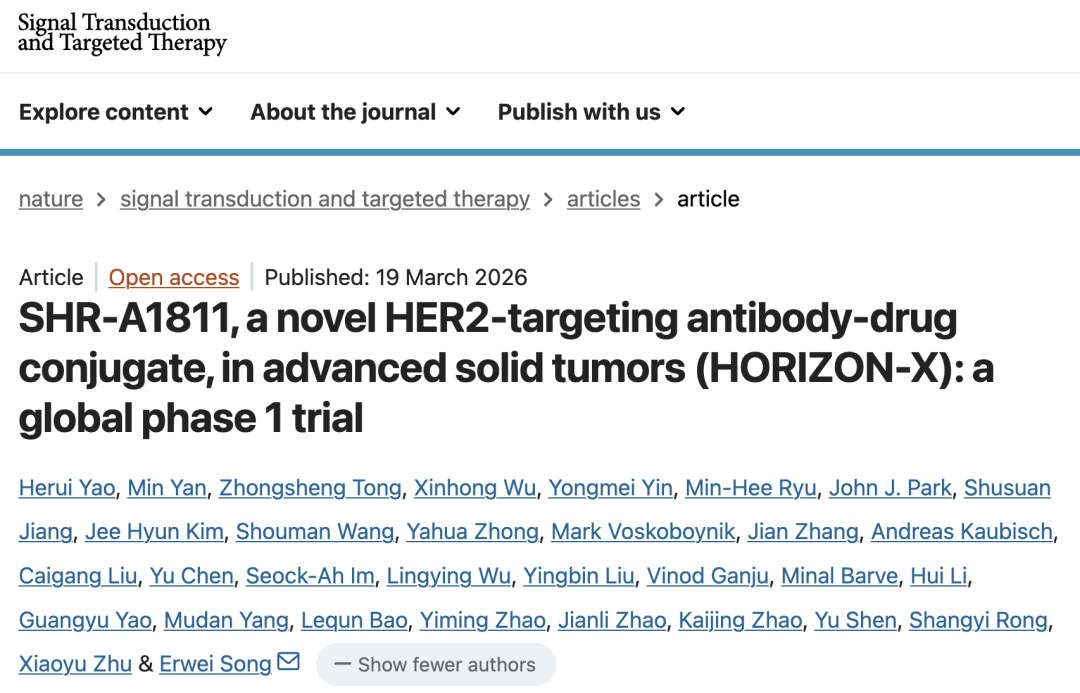2026 年 3 月 19 日,中山大学孙逸仙纪念医院宋尔卫院士团队在 Signal Transduction and Targeted Therapy 期刊发表了题为:SHR-A1811, a novel HER2-targeting antibody-drug conjugate, in advanced solid tumors (HORIZON-X): a global phase 1 trial 的临床研究论文。
