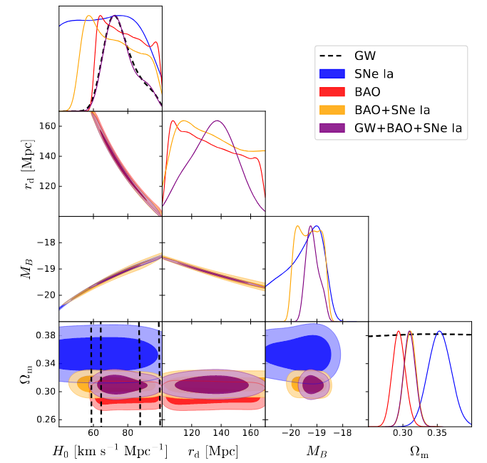 图1:标准宇宙学模型下,不同数据组合的哈勃常数、声学视界尺度、超新星绝对星等和物质密度参数二维后验分布。可以看出,引力波标准汽笛的加入能够显著打破其他探针中存在的参数简并。