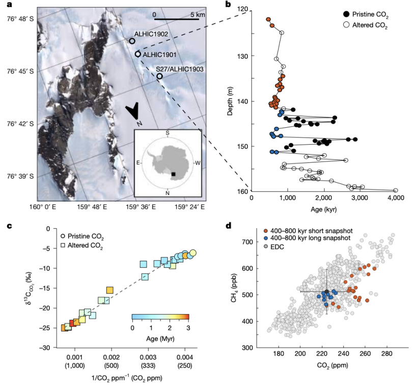 在两篇独立论文中,美国伍兹霍尔海洋研究所的Sarah Shackleto团队与美国俄勒冈州立大学科瓦利斯校区的Julia Marks-Peterso团队利用艾伦山冰芯,分别重建了过去300万年间的平均海洋温度及温室气体浓度记录。研究发现,290万至120万年前甲烷浓度无显著变化,二氧化碳浓度小幅下降(约20ppm);120万至80万年前气体浓度趋于稳定。这表明温室气体浓度可能并非两次气候转变的主因,但海洋温度变化似乎与气候转变存在关联。惰性气体浓度测量(氙气和氪气在不同温度下溶解,可作为海洋温度的替代指标)显示,约270万年前曾出现显著降温,随后在120万至80万年前维持稳定温度。