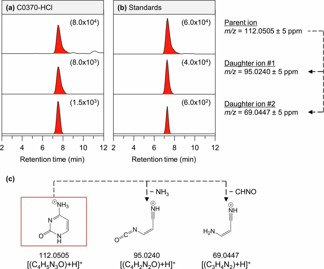 通过MS/MS实验在Ryugu C0370样本中鉴定出胞嘧啶。来源:Koga, et al.