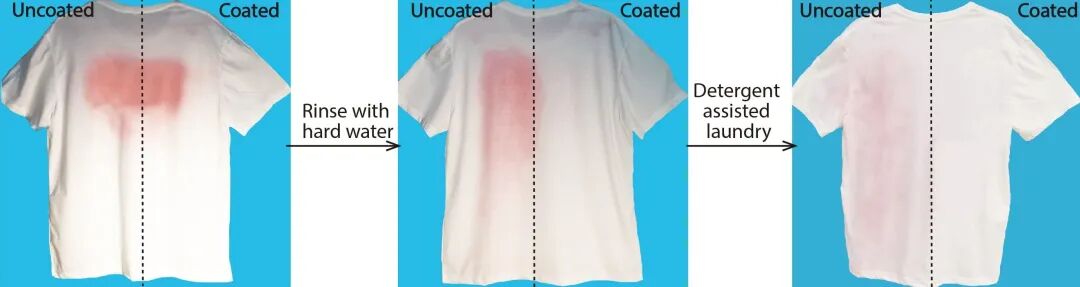 中国东南大学的程崇领、中国吉林大学的汪大洋和同事将两种化学物质——聚二烯丙基二甲基氯化铵(PDADMAC)和聚乙烯磺酸(PVS)——交替喷洒在衣物上,形成五层薄双层膜(由紧密排列的分子构成的双层结构)。这些双层结构形成了一种表面磺酸基密度极高的涂层,能够吸附并锁住一层水分子。这使得常见污渍无法附着在织物上,仅需在标准洗衣机中进行一次清水漂洗即可去除。
