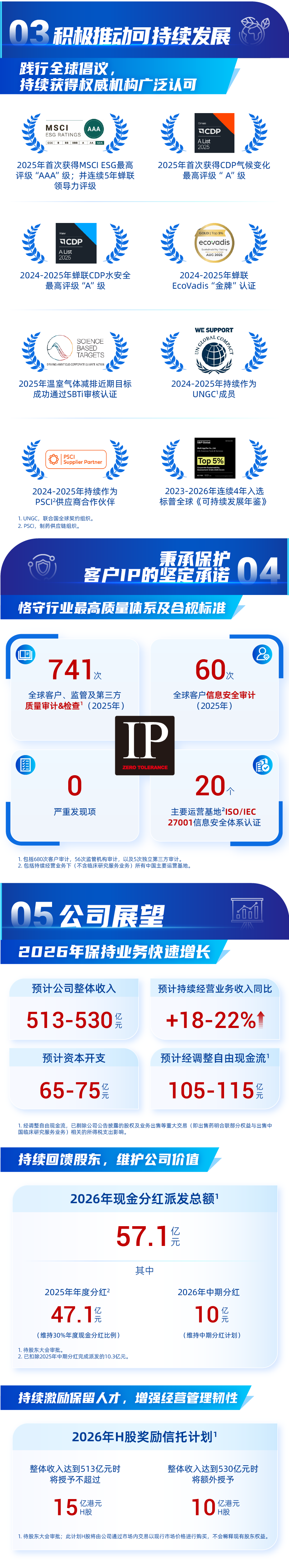 “2026年,公司将更加聚焦CRDMO核心战略,加速全球化能力建设和产能投放,持续提高生产经营效率,为客户和股东创造更大价值。公司预计2026年整体收入达到513-530亿元,持续经营业务收入实现18-22%同比快速增长,同时经调整自由现金流达到105-115亿元。”