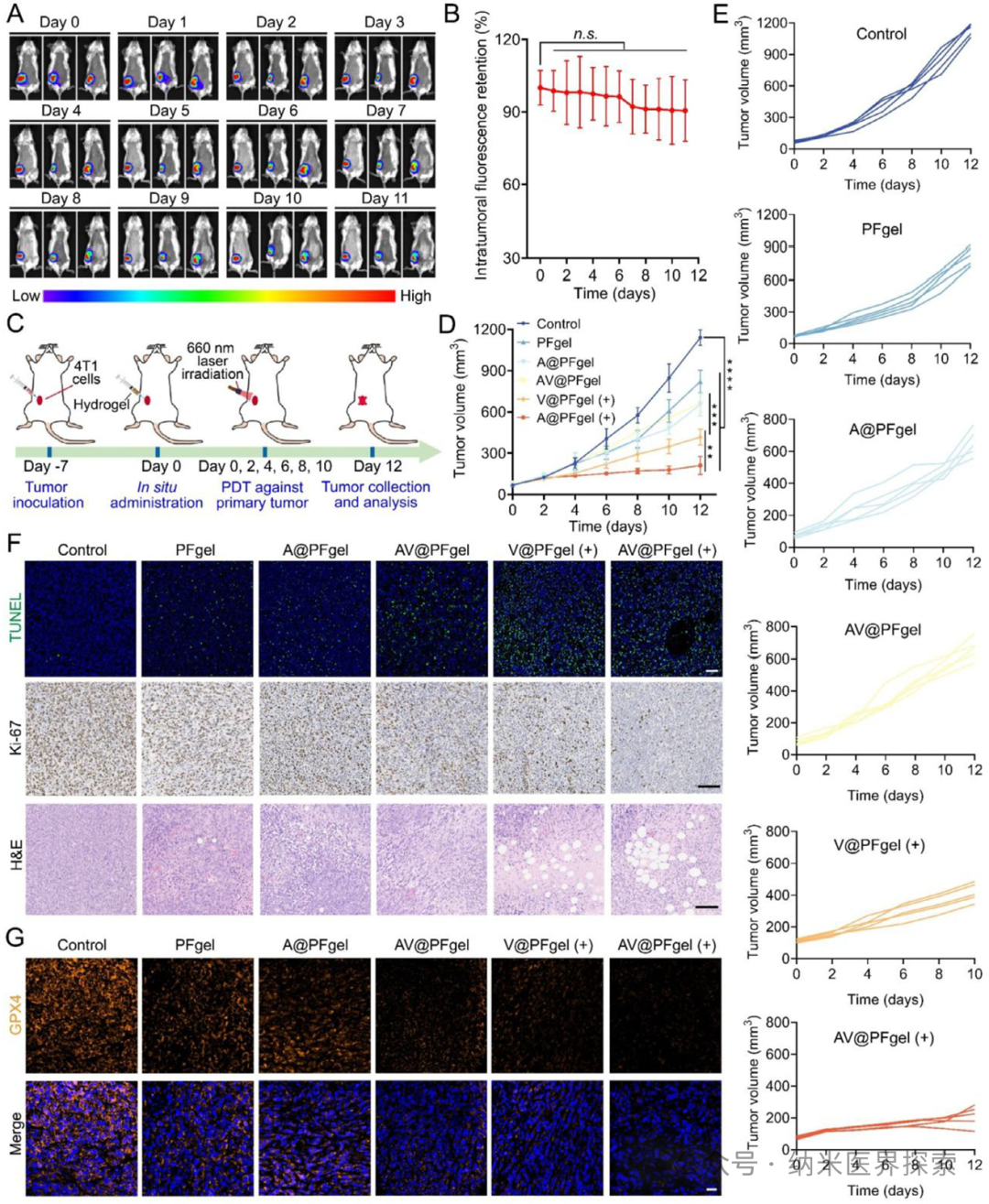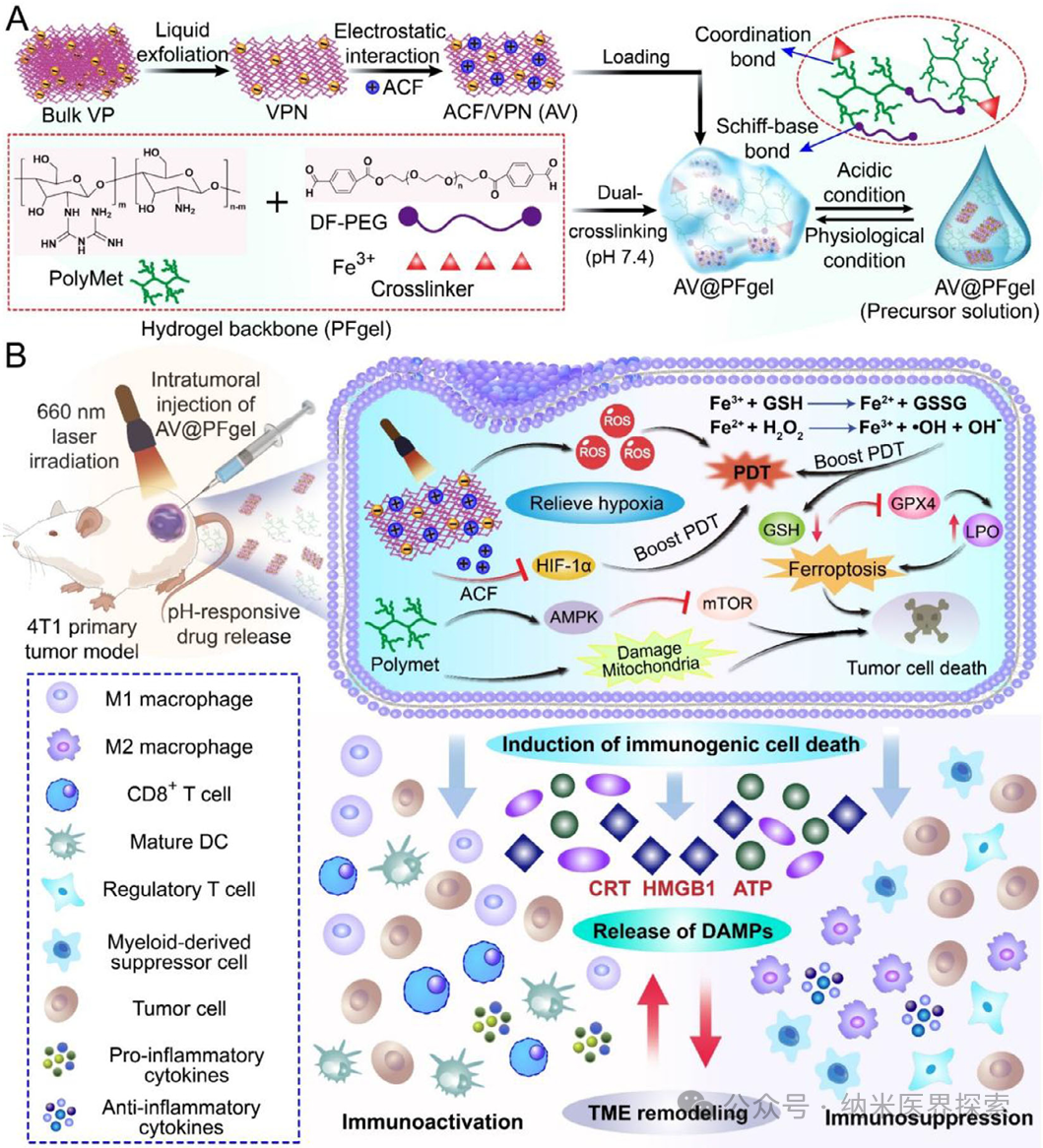 实体瘤缺氧一直是光动力治疗的老大难问题,还会引发免疫抑制、促进转移。这篇文章设计开发了一款可注射免疫水凝胶 AV@PFgel,把紫磷光动力、铁死亡、缺氧缓解和 HIF‑1α 抑制整合在一起。凝胶在肿瘤酸性环境下响应释药,激光照射后协同杀伤肿瘤、激活免疫,对原位和转移性三阴性乳腺癌都有很好的抑制效果,还能建立长期免疫记忆。