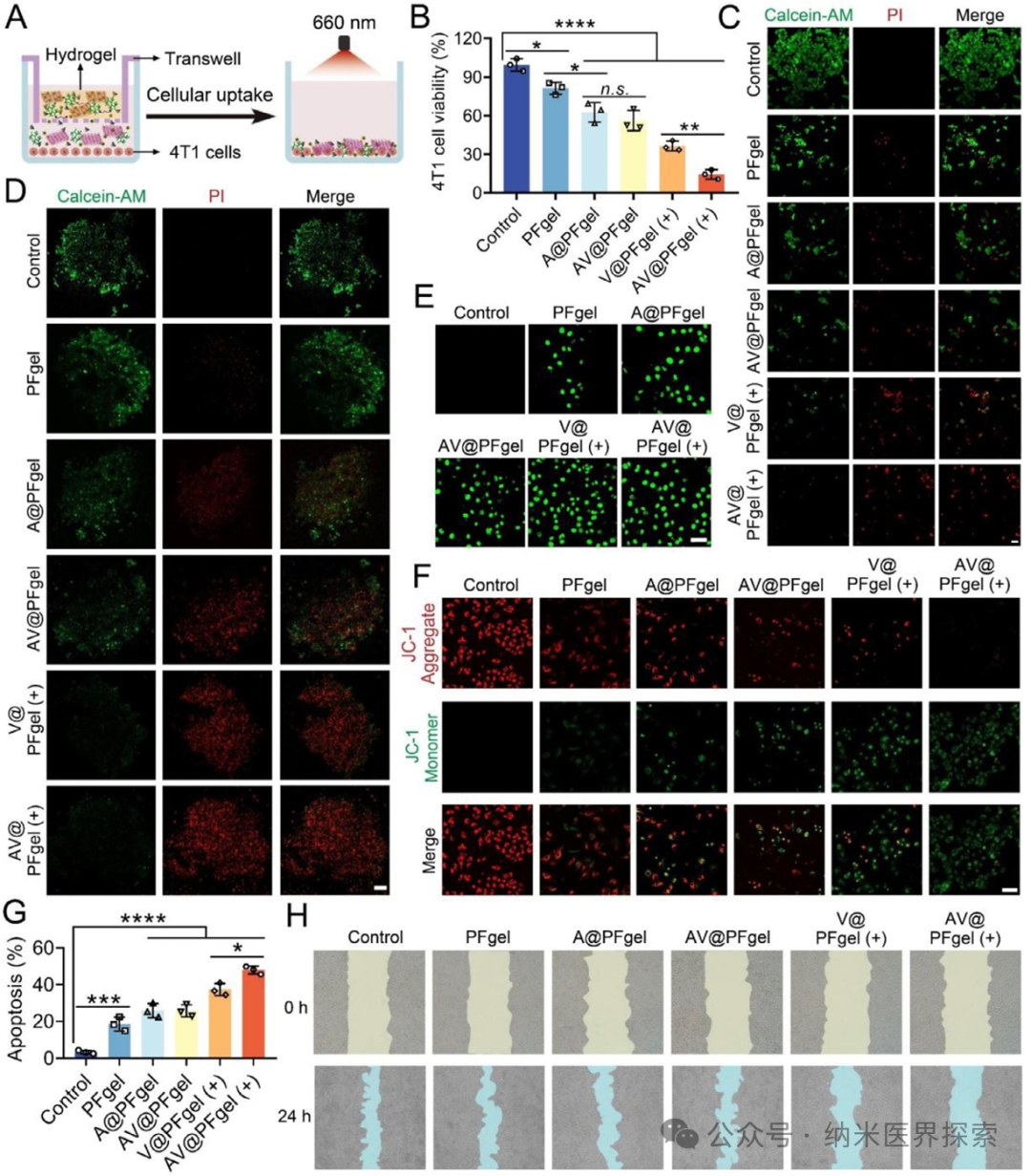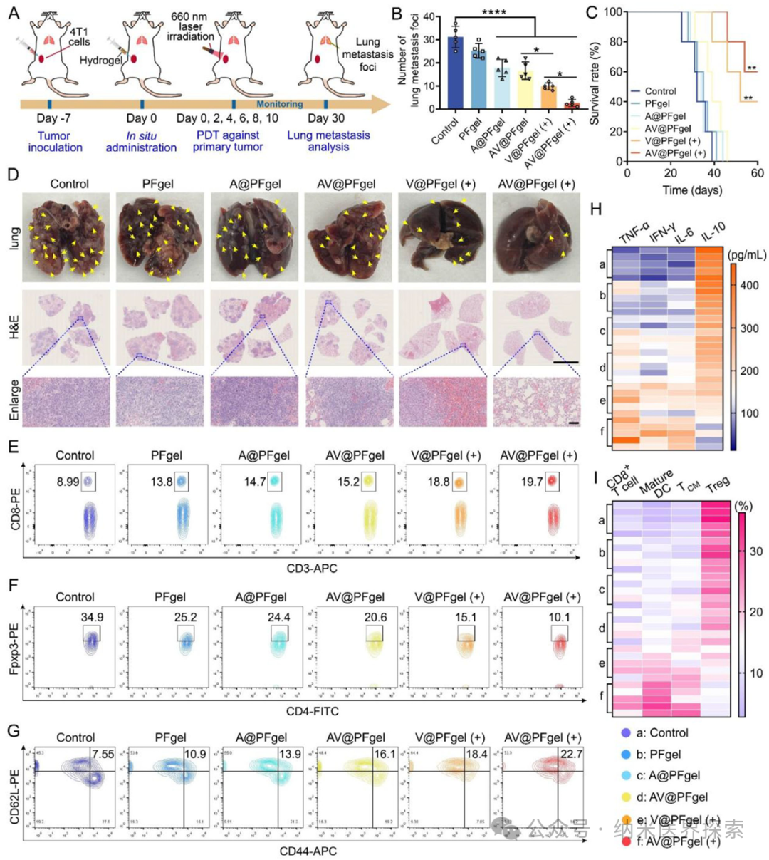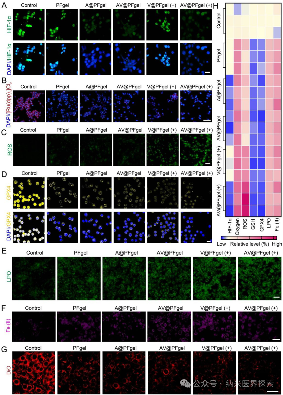 1️⃣ 首次将紫磷纳米片光动力治疗、铁死亡诱导、缺氧缓解、HIF-1α 抑制四大功能整合到单一可注射水凝胶体系,实现多机制协同抗癌2️⃣ 构建了双交联 pH 响应型水凝胶,在肿瘤酸性微环境精准降解,实现药物与活性成分的控释,兼顾注射性与自修复性3️⃣ 利用铁离子芬顿反应原位产氧,从根源解决光动力治疗的缺氧瓶颈,同时触发铁死亡,形成治疗正反馈4️⃣ 水凝胶载体兼具药物递送与免疫调控双重作用,重塑肿瘤免疫微环境,激活持久局部与全身抗肿瘤免疫5️⃣ 单次瘤内注射联合激光照射即可同时抑制原位肿瘤与肺转移,并建立长期免疫记忆,提升难治性三阴性乳腺癌治疗效果实体瘤普遍存在缺氧微环境,这不仅会促进肿瘤侵袭、转移和免疫逃逸,还会严重依赖氧气的光动力治疗效果大打折扣。缺氧会上调 HIF-1α,进一步诱导 PD-L1 高表达、招募调节性 T 细胞和肿瘤相关巨噬细胞,让肿瘤变成 “免疫沙漠”。光动力治疗本身还会消耗氧气,加重缺氧,形成恶性循环。铁死亡作为铁依赖性程序性死亡,能克服肿瘤凋亡耐药,还可触发免疫原性细胞死亡,但单独使用铁死亡或光动力都难以兼顾局部杀伤与全身免疫激活。传统递送体系合成复杂、生物相容性差、靶向性不足,无法实现缺氧缓解、铁死亡、光动力与免疫治疗的协同,临床转化难度大。三阴性乳腺癌易转移、预后差,现有疗法难以同时控制原位瘤与远处转移,急需一体化多功能治疗平台。作者设计开发了AV@PFgel 免疫工程化水凝胶,以聚二甲双胍为骨架,通过 Fe³+ 配位键与席夫碱双交联构建,负载阿克拉霉素 / 紫磷纳米片复合物。该水凝胶可注射、自修复,在肿瘤弱酸性环境下响应降解,缓慢释放聚二甲双胍、Fe³+ 和阿克拉霉素 / 紫磷纳米片。紫磷纳米片在 660 nm 激光下作为光敏剂产生活性氧,直接杀伤肿瘤并诱发免疫原性细胞死亡;Fe³+ 被还原为 Fe²+,通过芬顿反应分解肿瘤内 H₂O₂产氧、缓解缺氧,同时引发铁死亡,加剧脂质过氧化与细胞膜破裂;阿克拉霉素抑制 HIF-1α,阻断缺氧相关免疫抑制通路,下调 PD-L1。三者协同将肿瘤微环境重编程为免疫激活状态,激活 CD8+T 细胞、促肿瘤巨噬细胞极化,抑制调节性 T 细胞,实现对三阴性乳腺癌原位瘤与肺转移的高效抑制,同时建立长期免疫记忆。AV@PFgel 的制备流程及其结合光动力治疗(PDT)的抗肿瘤作用机制示意图作者首先通过液相剥离制备紫磷纳米片,静电吸附负载阿克拉霉素得到阿克拉霉素 / 紫磷复合物;再合成聚二甲双胍,与 Fe³+ 形成配位复合物,再与双苯甲醛 PEG 通过席夫碱反应构建双交联水凝胶,最终制得 AV@PFgel。对材料的形貌、粒径、电位、光谱、流变学性能、pH 响应降解与药物释放行为进行系统表征,验证水凝胶的注射性、自修复性与酸响应特性。Figure 1、AV@PFgel 的制备与表征。(A)紫磷纳米片(VPN)与阿克拉霉素 / 紫磷纳米片复合物(ACF/VPN)的透射电镜图;(B)VPN 与 ACF/VPN 的粒径及 Zeta 电位(n=3);(C)VPN、ACF/VPN 与 AV@PFgel 的扫描电镜图;(D)VPN、ACF/VPN 与 AV@PFgel 的能谱面扫;通过(E)在载玻片上书写字母、(F)用注射器挤出至 PBS 溶液(pH 7.4)中,评估 AV@PFgel 的可注射性;(G)AV@PFgel 的自修复性能表征;(H)AV@PFgel 凝胶化前后的溶胶 - 凝胶转变测试;(I)不同 pH 条件下 48 小时内聚二甲双胍(PolyMet)与阿克拉霉素(ACF)的累积释放曲线(n=3);(J)不同 pH 条件下 96 小时内 AV@PFgel 在 PBS 溶液中的状态观察。作者以 4T1 三阴性乳腺癌细胞为模型,检测材料细胞摄取、细胞毒性、凋亡、迁移侵袭能力;检测细胞内 HIF-1α、氧含量、活性氧、谷胱甘肽、GPX4、脂质过氧化物、Fe²+ 水平,验证缺氧缓解、光动力效应与铁死亡通路激活;检测免疫原性细胞死亡标志物、树突状细胞成熟、巨噬细胞极化及 PD-L1 表达,评估体外免疫激活效果。Figure 2、体外抗肿瘤活性。(A)采用 Transwell 共培养体系评估水凝胶制剂体外治疗效果的处理方法示意图;(B)不同处理 24 小时后 4T1 细胞的存活率(n=3);(C)不同处理 24 小时后钙黄绿素 - AM/PI 双染的 4T1 细胞(标尺:50 μm);(D)不同处理 24 小时后钙黄绿素 - AM/PI 双染的 4T1 肿瘤球(标尺:200 μm);(E)不同处理 24 小时后 4T1 细胞的 TUNEL 染色(标尺:50 μm)及(G)定量分析(n=3);(F)采用 JC-1 探针评估不同处理 24 小时后 4T1 细胞的线粒体功能(标尺:100 μm);(H)不同处理 24 小时后 4T1 细胞划痕愈合的照片。采用单因素方差分析及 Tukey 事后检验进行统计学分析,*p<0.05,**p<0.01,***p<0.001,****p<0.0001,n.s. 表示无统计学差异。作者构建了 4T1 原位乳腺癌小鼠模型,瘤内单次注射 AV@PFgel,联合 660 nm 激光照射,监测肿瘤生长、小鼠体重与生存期;检测肿瘤组织凋亡、增殖、缺氧、铁死亡、免疫细胞浸润与细胞因子水平;构建转移模型,观察肺转移灶数量,评估系统免疫激活与免疫记忆形成,同时验证材料体内生物相容性与降解性。Figure 3、体外抗肿瘤作用机制。(A)不同处理 24 小时后 4T1 细胞的 HIF-1α 免疫荧光染色(标尺:20 μm);(B)采用 [Ru (dpp)₃] Cl₂探针检测不同处理 24 小时后 4T1 细胞内氧含量(标尺:50 μm);(C)采用 DCFH-DA 探针检测不同处理 24 小时后 4T1 细胞内活性氧(ROS)水平(标尺:20 μm);(D)不同处理 24 小时后 4T1 细胞中 GPX4 的免疫荧光染色(标尺:20 μm);(E)采用 BODIPY⁵⁸¹/⁵⁹¹-C11 荧光探针检测不同处理 24 小时后 4T1 细胞内脂质过氧化物(LPO)水平(标尺:20 μm);(F)采用 FerroOrange 探针检测不同处理 24 小时后 4T1 细胞内 Fe²⁺