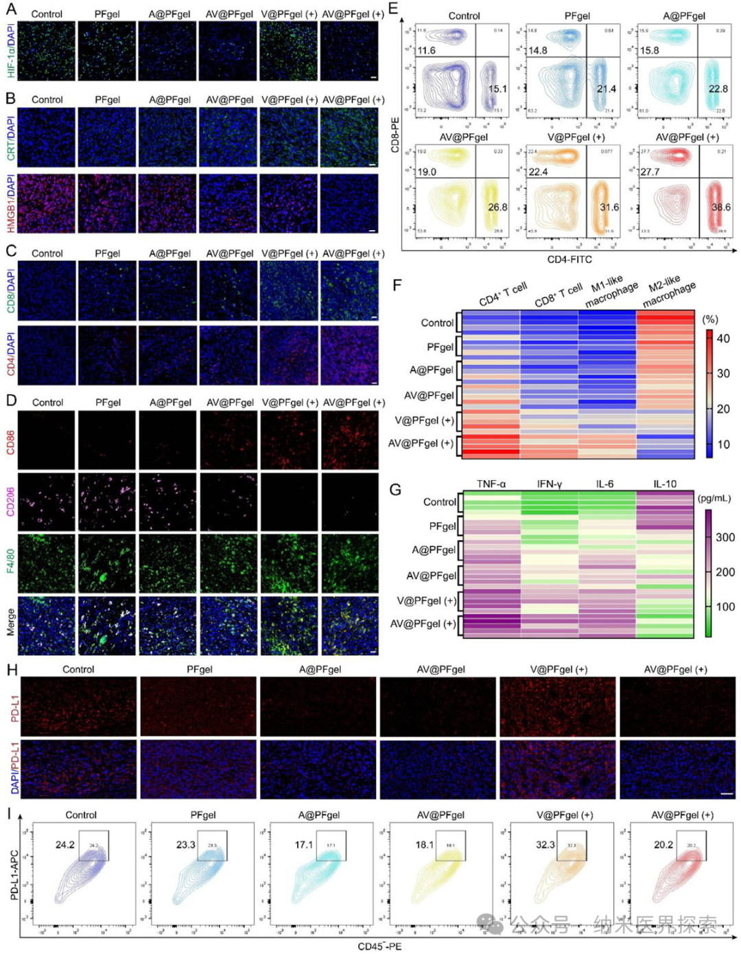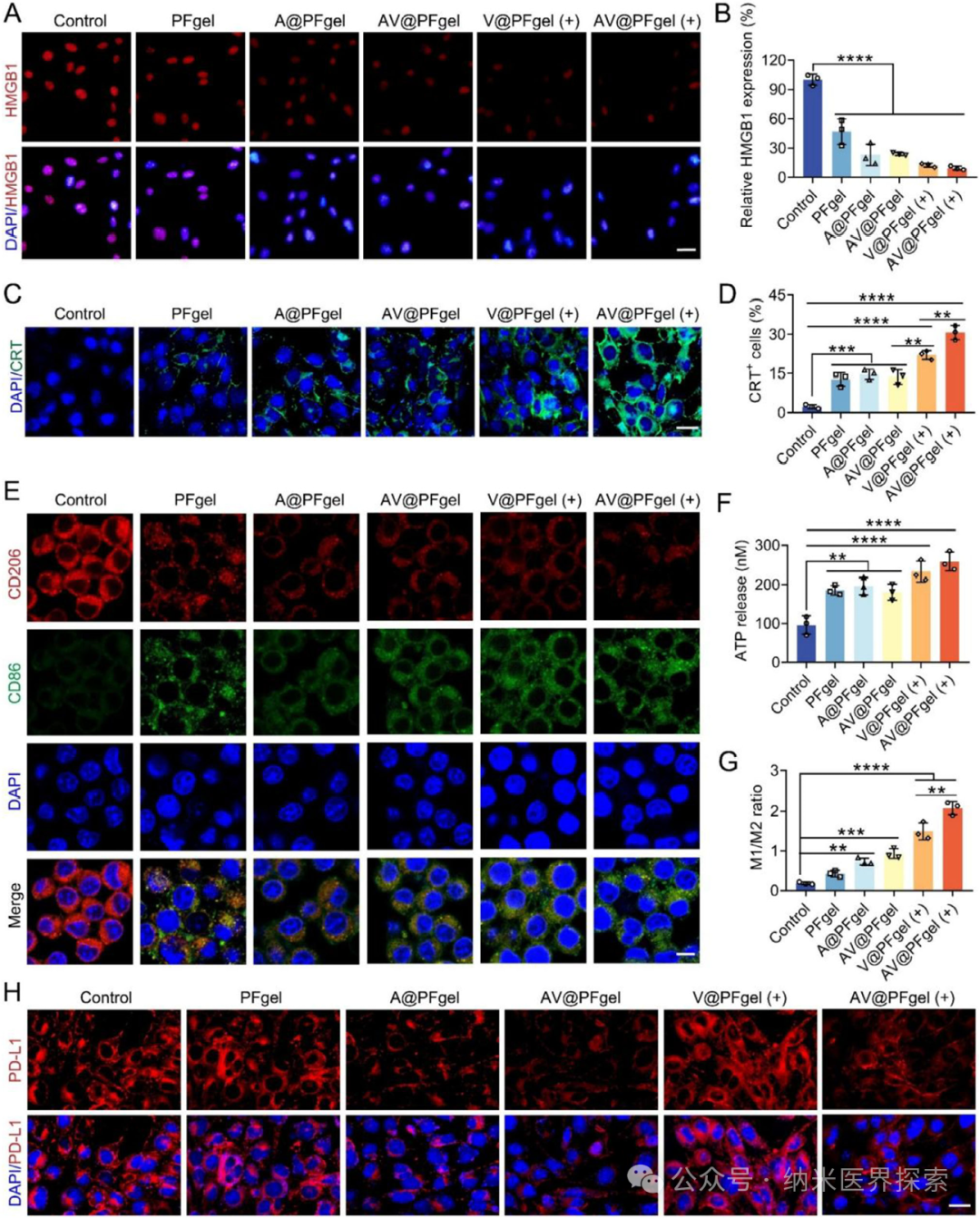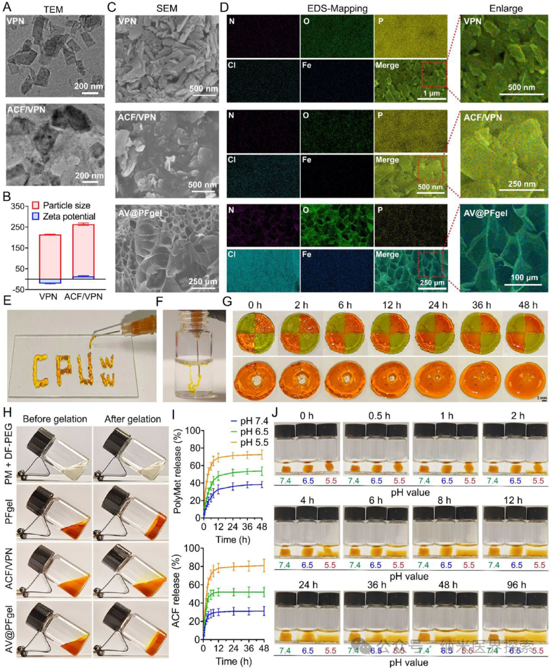 1️⃣ 首次将紫磷纳米片光动力治疗、铁死亡诱导、缺氧缓解、HIF-1α 抑制四大功能整合到单一可注射水凝胶体系,实现多机制协同抗癌2️⃣ 构建了双交联 pH 响应型水凝胶,在肿瘤酸性微环境精准降解,实现药物与活性成分的控释,兼顾注射性与自修复性3️⃣ 利用铁离子芬顿反应原位产氧,从根源解决光动力治疗的缺氧瓶颈,同时触发铁死亡,形成治疗正反馈4️⃣ 水凝胶载体兼具药物递送与免疫调控双重作用,重塑肿瘤免疫微环境,激活持久局部与全身抗肿瘤免疫5️⃣ 单次瘤内注射联合激光照射即可同时抑制原位肿瘤与肺转移,并建立长期免疫记忆,提升难治性三阴性乳腺癌治疗效果实体瘤普遍存在缺氧微环境,这不仅会促进肿瘤侵袭、转移和免疫逃逸,还会严重依赖氧气的光动力治疗效果大打折扣。缺氧会上调 HIF-1α,进一步诱导 PD-L1 高表达、招募调节性 T 细胞和肿瘤相关巨噬细胞,让肿瘤变成 “免疫沙漠”。光动力治疗本身还会消耗氧气,加重缺氧,形成恶性循环。铁死亡作为铁依赖性程序性死亡,能克服肿瘤凋亡耐药,还可触发免疫原性细胞死亡,但单独使用铁死亡或光动力都难以兼顾局部杀伤与全身免疫激活。传统递送体系合成复杂、生物相容性差、靶向性不足,无法实现缺氧缓解、铁死亡、光动力与免疫治疗的协同,临床转化难度大。三阴性乳腺癌易转移、预后差,现有疗法难以同时控制原位瘤与远处转移,急需一体化多功能治疗平台。作者设计开发了AV@PFgel 免疫工程化水凝胶,以聚二甲双胍为骨架,通过 Fe³+ 配位键与席夫碱双交联构建,负载阿克拉霉素 / 紫磷纳米片复合物。该水凝胶可注射、自修复,在肿瘤弱酸性环境下响应降解,缓慢释放聚二甲双胍、Fe³+ 和阿克拉霉素 / 紫磷纳米片。紫磷纳米片在 660 nm 激光下作为光敏剂产生活性氧,直接杀伤肿瘤并诱发免疫原性细胞死亡;Fe³+ 被还原为 Fe²+,通过芬顿反应分解肿瘤内 H₂O₂产氧、缓解缺氧,同时引发铁死亡,加剧脂质过氧化与细胞膜破裂;阿克拉霉素抑制 HIF-1α,阻断缺氧相关免疫抑制通路,下调 PD-L1。三者协同将肿瘤微环境重编程为免疫激活状态,激活 CD8+T 细胞、促肿瘤巨噬细胞极化,抑制调节性 T 细胞,实现对三阴性乳腺癌原位瘤与肺转移的高效抑制,同时建立长期免疫记忆。AV@PFgel 的制备流程及其结合光动力治疗(PDT)的抗肿瘤作用机制示意图作者首先通过液相剥离制备紫磷纳米片,静电吸附负载阿克拉霉素得到阿克拉霉素 / 紫磷复合物;再合成聚二甲双胍,与 Fe³+ 形成配位复合物,再与双苯甲醛 PEG 通过席夫碱反应构建双交联水凝胶,最终制得 AV@PFgel。对材料的形貌、粒径、电位、光谱、流变学性能、pH 响应降解与药物释放行为进行系统表征,验证水凝胶的注射性、自修复性与酸响应特性。Figure 1、AV@PFgel 的制备与表征。(A)紫磷纳米片(VPN)与阿克拉霉素 / 紫磷纳米片复合物(ACF/VPN)的透射电镜图;(B)VPN 与 ACF/VPN 的粒径及 Zeta 电位(n=3);(C)VPN、ACF/VPN 与 AV@PFgel 的扫描电镜图;(D)VPN、ACF/VPN 与 AV@PFgel 的能谱面扫;通过(E)在载玻片上书写字母、(F)用注射器挤出至 PBS 溶液(pH 7.4)中,评估 AV@PFgel 的可注射性;(G)AV@PFgel 的自修复性能表征;(H)AV@PFgel 凝胶化前后的溶胶 - 凝胶转变测试;(I)不同 pH 条件下 48 小时内聚二甲双胍(PolyMet)与阿克拉霉素(ACF)的累积释放曲线(n=3);(J)不同 pH 条件下 96 小时内 AV@PFgel 在 PBS 溶液中的状态观察。作者以 4T1 三阴性乳腺癌细胞为模型,检测材料细胞摄取、细胞毒性、凋亡、迁移侵袭能力;检测细胞内 HIF-1α、氧含量、活性氧、谷胱甘肽、GPX4、脂质过氧化物、Fe²+ 水平,验证缺氧缓解、光动力效应与铁死亡通路激活;检测免疫原性细胞死亡标志物、树突状细胞成熟、巨噬细胞极化及 PD-L1 表达,评估体外免疫激活效果。Figure 2、体外抗肿瘤活性。(A)采用 Transwell 共培养体系评估水凝胶制剂体外治疗效果的处理方法示意图;(B)不同处理 24 小时后 4T1 细胞的存活率(n=3);(C)不同处理 24 小时后钙黄绿素 - AM/PI 双染的 4T1 细胞(标尺:50 μm);(D)不同处理 24 小时后钙黄绿素 - AM/PI 双染的 4T1 肿瘤球(标尺:200 μm);(E)不同处理 24 小时后 4T1 细胞的 TUNEL 染色(标尺:50 μm)及(G)定量分析(n=3);(F)采用 JC-1 探针评估不同处理 24 小时后 4T1 细胞的线粒体功能(标尺:100 μm);(H)不同处理 24 小时后 4T1 细胞划痕愈合的照片。采用单因素方差分析及 Tukey 事后检验进行统计学分析,*p<0.05,**p<0.01,***p<0.001,****p<0.0001,n.s. 表示无统计学差异。作者构建了 4T1 原位乳腺癌小鼠模型,瘤内单次注射 AV@PFgel,联合 660 nm 激光照射,监测肿瘤生长、小鼠体重与生存期;检测肿瘤组织凋亡、增殖、缺氧、铁死亡、免疫细胞浸润与细胞因子水平;构建转移模型,观察肺转移灶数量,评估系统免疫激活与免疫记忆形成,同时验证材料体内生物相容性与降解性。Figure 3、体外抗肿瘤作用机制。(A)不同处理 24 小时后 4T1 细胞的 HIF-1α 免疫荧光染色(标尺:20 μm);(B)采用 [Ru (dpp)₃] Cl₂探针检测不同处理 24 小时后 4T1 细胞内氧含量(标尺:50 μm);(C)采用 DCFH-DA 探针检测不同处理 24 小时后 4T1 细胞内活性氧(ROS)水平(标尺:20 μm);(D)不同处理 24 小时后 4T1 细胞中 GPX4 的免疫荧光染色(标尺:20 μm);(E)采用 BODIPY⁵⁸¹/⁵⁹¹-C11 荧光探针检测不同处理 24 小时后 4T1 细胞内脂质过氧化物(LPO)水平(标尺:20 μm);(F)采用 FerroOrange 探针检测不同处理 24 小时后 4T1 细胞内 Fe²⁺