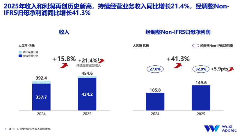 营收端,其2025年全年实现454.6亿元整体营收,同比增长15.8%,其中持续经营业务收入同比增长高达21.4%;利润端,药明康德经调整归母净利润约149.6亿元,同比大增41.3%,经调整non-IFRS毛利率同比提升6.6个百分点,达到48.2%。大体量之上的持续高速增长,令人惊叹。
