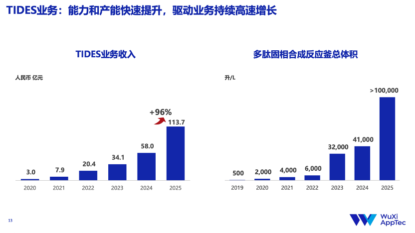 随着新增产能爬坡,2025年,药明康德TIDES业务营收突破百亿,达到113.7亿元,在手订单同比增长20.2%,其能力、规模恐怕还会在行业内持续领跑很长一段时间。