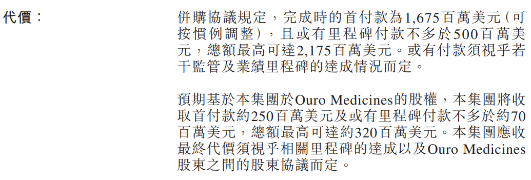 基于康诺亚拥有的15%少数股权,将收取约2.5亿美元预付款,以及不多于约7000万美元里程碑金额,总金额最高可达3.2亿美元。