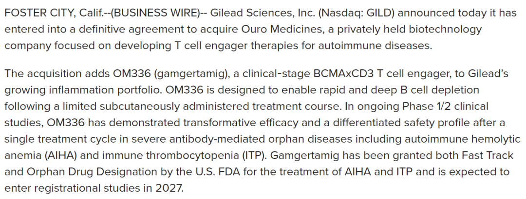 2026年3月23日,吉利德与Ouro Medicines达成收购协议,获得其BCMA/CD3双抗新药CM336。