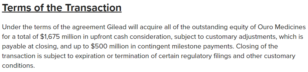 根据协议,吉利德支付16.75亿美元预付款,5亿美元里程碑金额,交易总金额高达21.75亿美元。