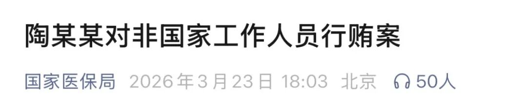 今天傍晚,国家医保局发布《陶某某对非国家工作人员行贿案》一文,和之前国家医保局分享的案例一样,这个案例也是根据法院刑事判决书摘录,涉及的产品是“高渗海水鼻腔喷雾器”,按方提成,行贿金额46.5万元。