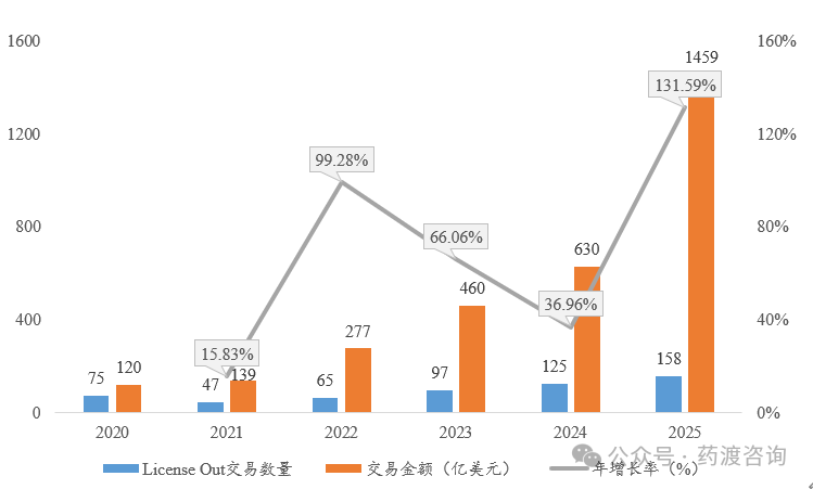 图4 2020-2025年中国医药License-Out交易数量及金额情况