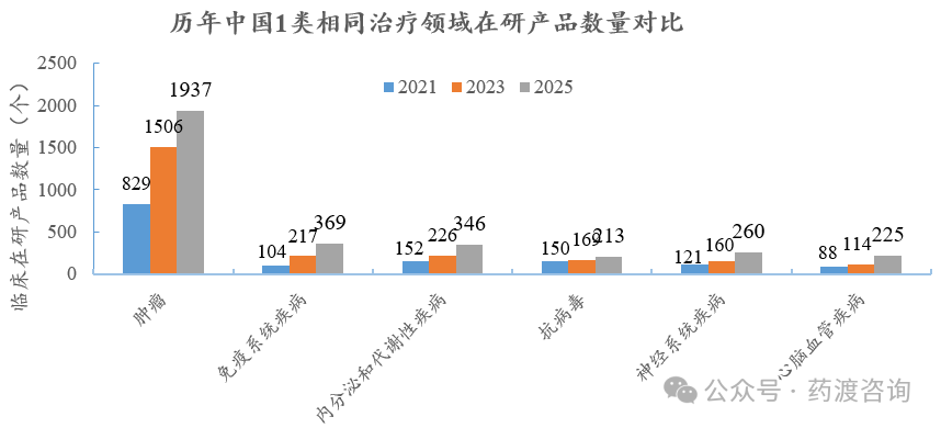 未来篇——重点关注中国创新药研发格局与发展动力。与2021及2023年相比,2025年中国1类临床在研产品的数量增长较为明显,数量由2023年的2817个增长到3760个。且肿瘤领域的在研产品数量依旧保持绝对领先,免疫系统疾病、内分泌和代谢性疾病、神经系统疾病、心脑血管疾病的在研产品数量较2023年增长幅度均超50%。