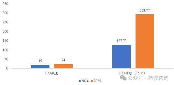 图1 2024及2025年中国生物医药企业IPO上市数及对应募资金额