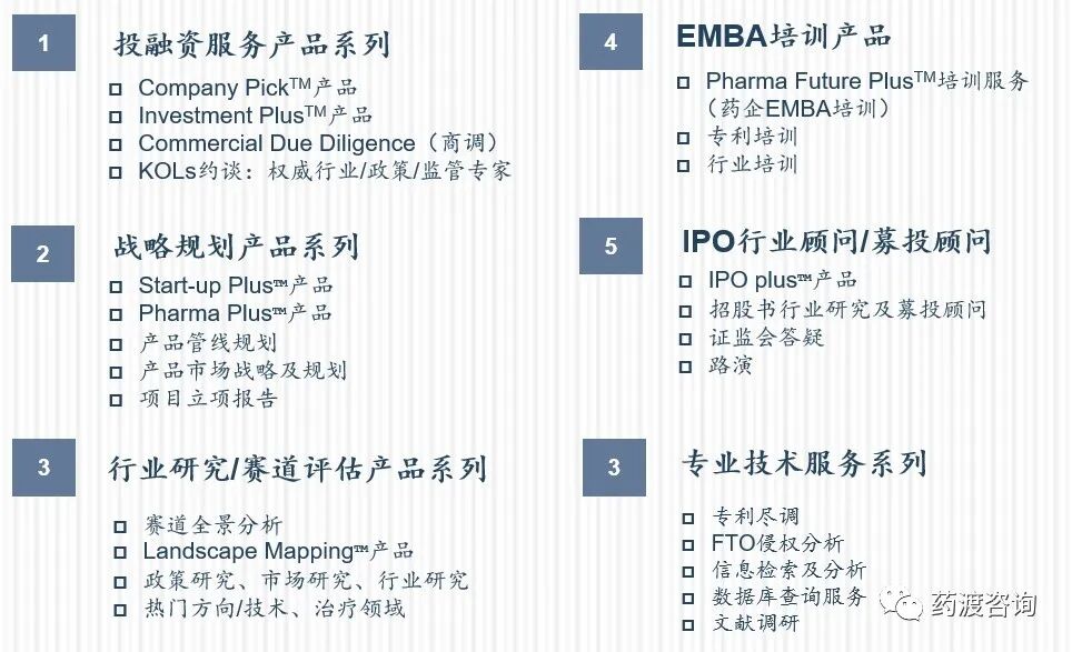 ◢ 服务客户覆盖医药行业全产业链,针对不同客户,提供专业技术分析及商业解决方案。深度咨询服务产品包括: