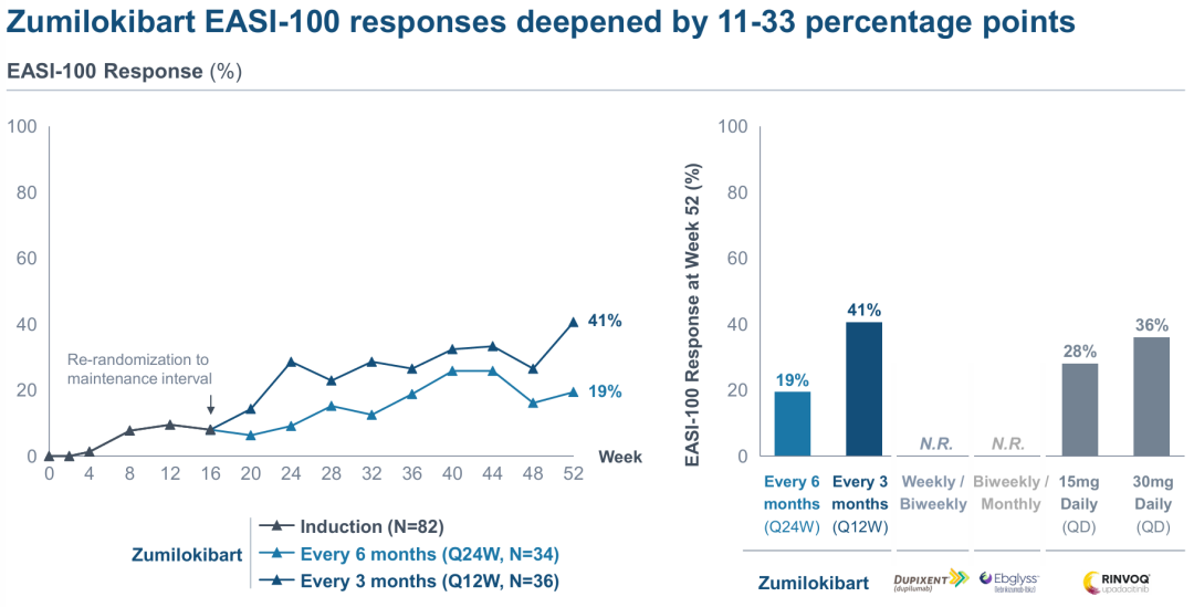 在全部接受治疗的患者群体中(包括16周时未完全应答者),疗效呈现持续加强趋势。整体EASI-90应答率在3个月和6个月给药组分别达到75%和48%,EASI-100应答率分别为41%和19%。