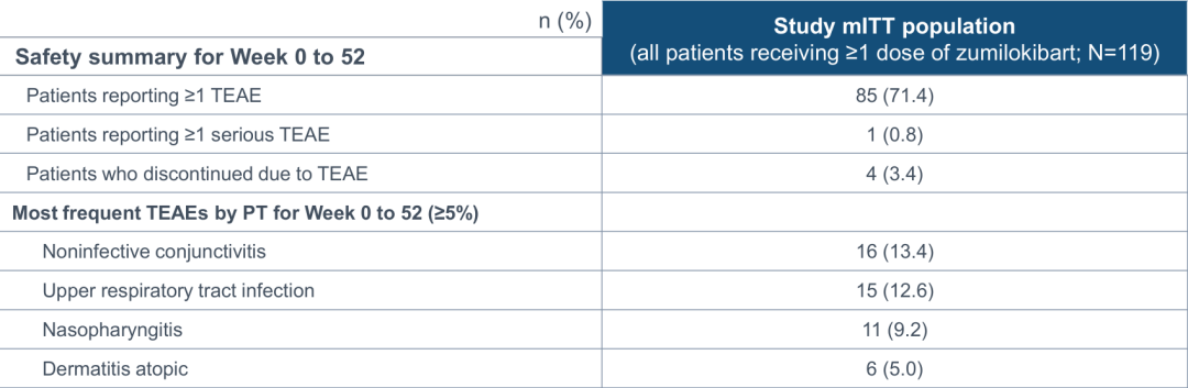 安全性方面,APG777在52周完整研究期间耐受性良好。治疗期间出现的不良事件(TEAE)发生率为71.4%(n=85),严重不良事件率为0.8%(n=1),因TEAE率为3.4%(n=4)。最常见的治疗后出现的不良事件为非感染性结膜炎、上呼吸道感染和鼻咽炎。